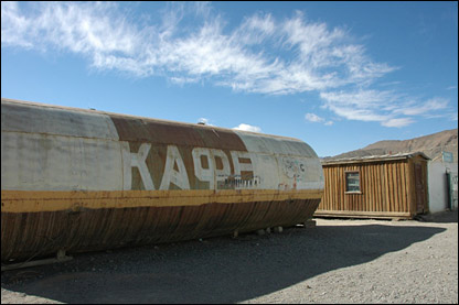 "در عکس یک کانتینر فلزی دیده می شود که تبدیل به یک کافه در بازار مرکزی ناحيه مرغاب شده است. زندگی در دشت ها دشوار است. زمين حتی قابليت کشت سيب زمينی را ندارد."