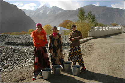 "زنان روستای لنگر در دره واخان هنگام حمل آب آشاميدنی به خانه هايشان. روستای لنگر فاقد شبکه تامین آب آشاميدنی است."