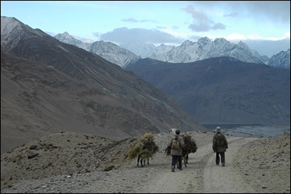 "کوه های پوشيده از برف هندوکش منظره چشمگيری را به نمایش گذاشته است. در این عکس روستائيان هنگام حمل چوب به روستای لنگر در دره واخان ديده می شوند."