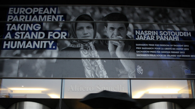 تصویر نسرین ستوده وکیل زندانی و جعفر پناهی کارگردان ایرانی بر سر در اتحادیه اروپا نصب شده است عکس: محمد تنگستانی