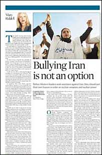 تحليلگر آبزرور معتقد است اهداف معاهده منع گسترش سلاحهای هسته ای که از يکسو در پی برچيدن تسليحات هسته ای است و از سوی ديگر گسترش کاربردهای انرژی هسته ای را دنبال می کند، متناقض هستند. چرا که به نوشته خانم ريدل، هرکشوری می تواند يک برنامه هسته ای غيرنظامی را آغاز کند، سپس با مهلتی شش ماهه از معاهده ان پی تی خارج شود و بعد جنگ افزار اتمی توليد کند. خانم ريدل از زبان دانشجويان ايرانی می پرسد چرا درحالی که اسرائيل، مسلح به جنگ افزار هسته ای است، ايران نبايد يک اهرم بازدارنده در اختيار داشته باشد؟ و در پاسخ، اين تحليلگر می نويسد به اين دليل که آقای احمدی نژاد، وقوع کشتار جمعی يهوديان در جنگ دوم جهانی را انکار می کند و معتقد است اسرائيل بايد از صحنه جهان محو شود و اگر انگشت او بر دگمه شليک يک سلاح هسته ای قرار داشته باشد، هيچکس نميتواند آسوده بخوابد. خانم ريدل همچنين می نويسد اسرائيل اگر مايل به انجام يک حمله پيشگيرانه است، بايد هم اکنون اقدام کند، چرا که به اعتقاد اين نويسنده، نيروگاه هسته ای بوشهر به احتمال زياد آغاز به کار خواهد کرد و حمله به آن، فاجعه ای با عواقب شبيه به فاجعه چرنوبيل را درپی خواهد داشت. اين نويسنده در نهايت سياستهای بريتانيا در قبال تجديد زرادخانه موشکهای هسته ای اش را به باد انتقاد می گيرد و می نويسد دوره شايسته سالاری هسته ای گذشته و دمکراسی هسته ای فرا رسيده که در آن ايران، خشمگين از دورويی غرب در مسابقه هسته ای، معتقد است اگر داشتن سلاح هسته ای برای غرب پسنديده است، برای آنها هم خوب است. اما به اعتقاد اين نويسنده، اميد وجود دارد که در رهبری ايران و آمريکا تغييراتی ايجاد شود و در غرب کسانی در راس کار قرار گيرند که خود نيز از شمار سلاح هايشان بکاهند. ساندی تايمز: 'طرح حمله به ايران'