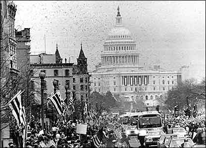 آمريکايی های آزادشده از آلمان به واشنگتن برده شدند و پيش از آنکه با رونالد ريگان در کاخ سفيد ديدار کنند، از آنها در خيابان پنسيلوانيا همچون قهرمانان استقبال شد. اين بحران هرچند اميدهای دولت کارتر را برای انتخاب مجدد به فنا داد اما به آقای ريگان در آغاز رياست جمهوری اش، کمک بزرگی کرد.در چنين شرايطی برخی بدبينان، زمانبندی مناسب آزادی گروگانها از سوی ايران را يادآور می شوند.