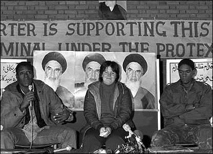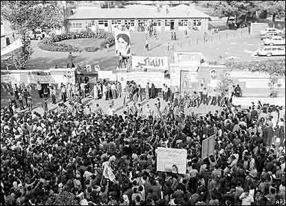 انقلاب: دانشجويان انقلابی، در چهارم نوامبر 1979، به سفارت ايالات متحده در تهران يورش بردند و دهها نفر از کارکنان آمريکايی سفارت را به گروگان گرفتند. هزاران نفر ديگر از معترضان در پاسخ به دعوت آيت الله خمينی، رهبر تازه ايران برای حمله به منافع آمريکا و اسرائيل، در اطراف محوطه تجمع کردند.