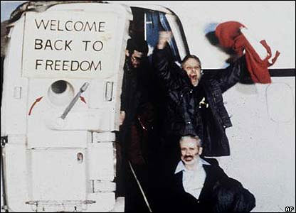 آزادی: پس از ماهها مذاکرات با ميانجيگری الجزاير و مرگ شاه، سرانجام ديپلماسی آمريکا به ثمر رسيد.روز بيستم ژانويه 1981، همزمان با مراسم تحليف پرزيدنت رونالد ريگان، گروگانها آزاد شدند. روز بعد آنها از طريق پايگاه نيروی هوايی آمريکا در آلمان غربی، راهی آمريکا شدند و به اين کشور بازگشتند.در اين تصوير، ديويد رودر، وابسته نيروی هوايی آمريکا هنگامی که به خاک آلمان وارد می شود، از شادمانی فرياد می کشد.