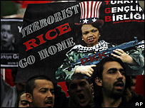 تظاهرکنندگان در اعتراض به سفر خانم رایس به ترکیه، تجمع هایی برپا کرده اند. در این تجمع های اعتراضی، پلاکاردی با تصویر خانم رایس، ملبس به لباس چریک های پ ک ک دیده می شود که بر روی آنها نوشته شده "رایس تروریست، به خانه بازگرد." ترکیه خواهان آن است تا آمریکا علیه فعالیت های پ ک ک در شمال عراق وارد عمل شود. خانم رایس روز جمعه در دیدار با علی باباجان، وزیر امور خارجه ترکیه، پ ک ک را دشمن مشترک ترکیه، عراق و آمریکا خواند. قرار است وزرای خارجه ترکیه، آمریکا و عراق در حاشیه نشست با یکدیگر دیدار کنند. |