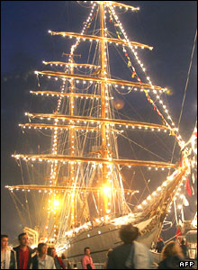 جهانگردان در حال بازديد از کشتی پرتغالی در پنجاهمين سالگرد مسابقه کشتیرانی موسوم به کشتی های بلند که در غرب فرانسه برگزار می شود.