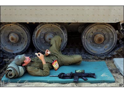 سرباز اسرائيلی در کنار تانک در نزديکی مرز اسرائيل با نوار غزه استراحت می کند. روز سه شنبه 11 ژوئيه پس از اينکه رهبران حماس اعلام کردند سرباز اسرائيلی که حدود 2 هفته پيش به اسارت حماس در آمد، آزاد نخواهد شد، رهبران اسرائيلی دستور حملات تازه ای را به روی نوار غزه صادر کردند