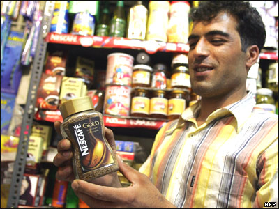 يک فروشنده ايرانی در حال نشان دادن شيشه نسکافه. تلويزيون دولتی ايران مردم را ترغيب کرده که از خريد محصولات 'صيهونيستی' خودداری کنند. اين برنامه تلويزيونی از جمله اين محصولات را کوکاکولا و مواد خوراکی نستله معرفی کرده است.