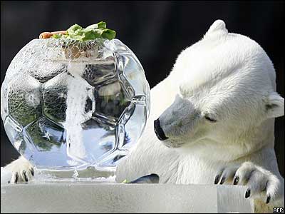خرس قطبی و قطعه يخی به شکل توپ فوتبال که با کاهو و هويج تزيين شده در باغ وحش برلين. دمای هوا در آلمان به 35 درجه رسيده است.