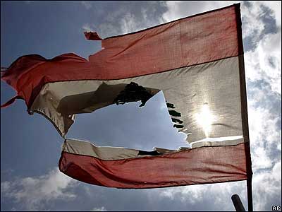 پرچم پاره شده لبنان در شهر نباتيه اين کشور. هواپيماهای جنگی اسرائيل روز شنبه حملات خود در سرتاسر لبنان را از سر گرفتند. اسرائيل هشدار داده که صدها هزار تن از ساکنان جنوب لبنان، اين منطقه را "فورا" تخليه کنند، زيرا اين کشور در حال آماده سازی خود برای تهاجم زمينی و ايجاد يک منطقه حائل در جنوب لبنان است.