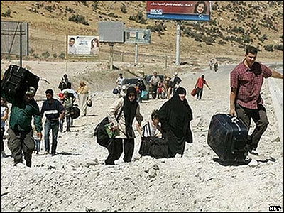 جنگزدگان لبنانی از ميان مخروبه ها می گذرند تا خود را به خاک سوريه برسانند.
