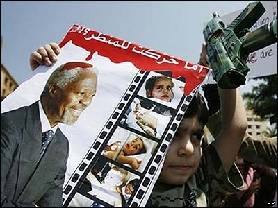 تظاهرات کنندگان لبنانی با در دست داشتن پوستری که کودکی را نشان می دهد که در جريان حمله نيروهای اسرائيلی به روستای قانا کشته شده، حملات اسرائيل را به جنوب لبنان محکوم می کنند. |