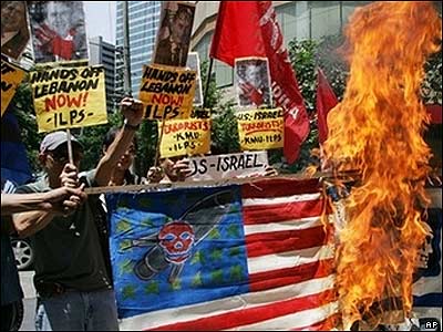 تظاهرکنندگان در شهر ماکاتی در شرق مانيل پايتخت فيليپين پرچم آمريکا و اسرائيل را آتش می زنند.