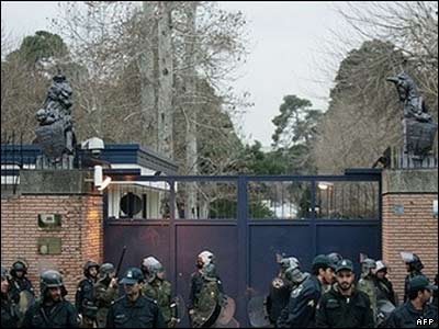 سفارت بريتانيا در تهران هدف کوکتل مولوتوفها و سنگهايی قرار گرفته که بيش از پنجاه بسيجی ايرانی در تظاهرات عليه موضع بريتانيا در قبال بحران لبنان پرتاب کرده اند