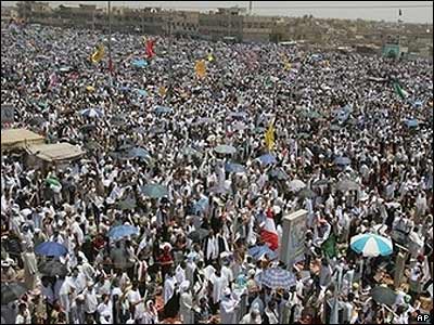 هزاران شيعه عراقی در تظاهراتی عليه حمله اسرائيل به لبنان در شهرک صدر در حومه بغداد شرکت جسته اند