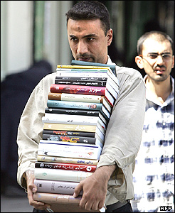 مردی در تهران کتابهايی را که از کتابفروشی های جلوی دانشگاه تهران خريده است، با خود حمل می کند. محمود احمدی نژاد، رئيس جمهور ايران، در جمع گروهی از دانشجويان با انتقاد از پيشينه نظام آموزشی ايران گفته است: "دانشجو بايد عليه انديشه های ليبرال و اقتصاد ليبرال فرياد بزند."
