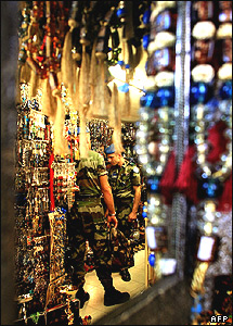 بازتاب تصويرسربازان پاسدار صلح فرانسوی در آينه مغازه ای در جنوب بيروت، لبنان