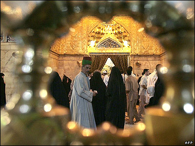زائرين عراقی در حرم امام حسين در شهر کربلا. انتظار می رود صدها هزار شيعه برای شرکت در مراسم مذهبی نيمه شعبان به کربلا بيايند.