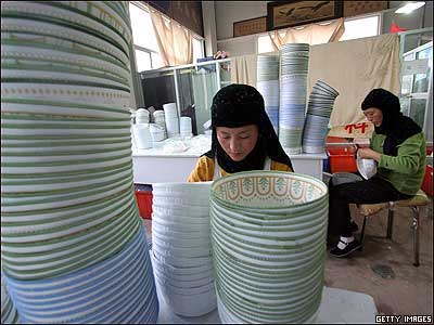 کارگران مسلمان چينی در کارخانه توليد کلاههايی که برخی مسلمانان هنگام نماز خواندن بر سر می گذارند. اين کارخانه که در شهر شونهوا در غرب چين واقع است، سالانه حدود يکصد ميليون از اين نوع کلاه توليد می کند.