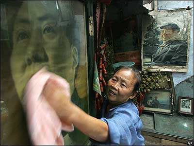 زنی در حال تميز کردن تصوير قاب شده ای از مائو، رهبر پيشين چين در نمايشگاهی از يادمانهای مائو در اين کشور. هزاران يادمان از مائو که از سال 1951 توسط وانگ آنيان جمع آوری شده، در اين نمايشگاه به تماشا گذاشته شده است.