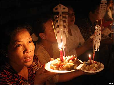 زنان با شمع و ظروف غذا در يک جشنواره سنتی در پنوم پن، پايتخت کامبوج. شرکت کنندگان در اين مراسم 15 روزه، ضمن دعا برای مردگان به معبد بوداييان رفته و برای راهبان غذا می برند.