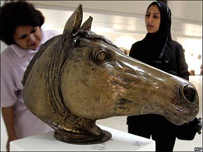 لاميا جاسم، هنرمند عراقی که مدت 23 سال است برای 'مرکز هنری بغداد' کار می کند، تاريخچه يک مجسمه برنزی را برای بازديد کنندگان مرکز تشريح می کند.