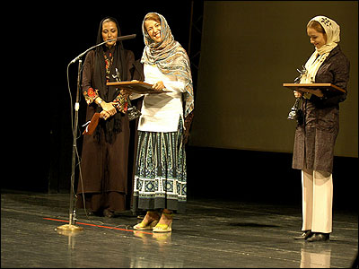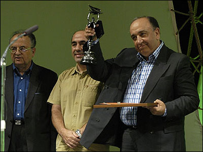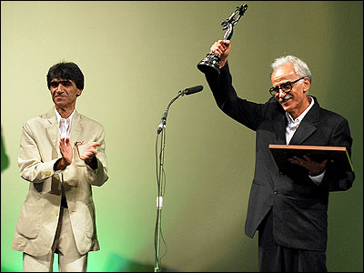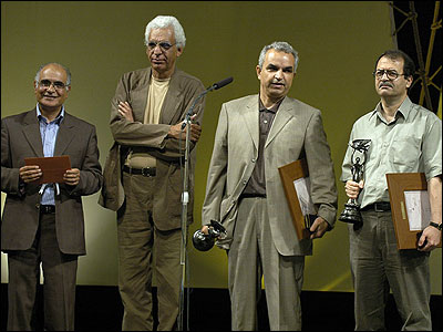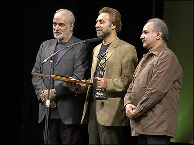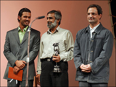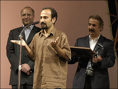 اصغر فرهادی جايزه بهترين کارگردانی را برای ساخت فيلم "چهارشنبه سوری" از مجيد مجيدی (راست) و محمدباقر قاليباف (چپ) دريافت کرد |