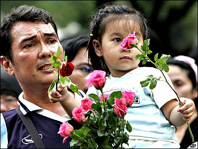 در پی وقوع کودتا در تايلند مردی دختر خود را برای پخش کردن گل بين سربازان به خيابان آورده است.