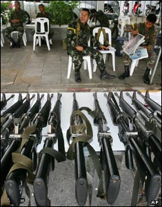 سربازان تايلندی در مقابل مقر دولت در بانکوک. در پی کودتايی که اخيرا در کشور رخ داده، هياتی ماموريت يافته تا آنچه را فساد مالی دولت قبلی خوانده شد، بررسی کند. |