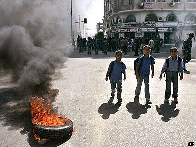 کودکان فلسطينی در کنار تايرهایی که توسط پليس فلسطينی به آتش کشيده شده اند. اعضای نيروی پليس در تشکيلات فلسطينی به عدم پرداخت حقوقشان اعتراض کردند.