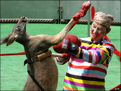 يک کارمند سيرک در چين در حال بوکس با يک کانگوروی استراليايی در المپيک سال 2006 حيوانات که در شانگهای برگزار می شود.