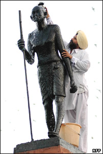 مردی در هند با شير مجسمه گاندی را شستشو می دهد. اين مراسم به مناسبت تولد وی در شهر امريتسار برگزار شده است.