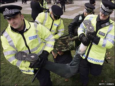 پلیس لندن در حال جابجا کردن یکی از فعالان ضد جنگ در مقابل پارلمان بريتانيا. این معترضان به مناسبت بازگشایی مجدد پارلمان در مقابل آن جمع شده بودند.