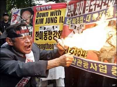 در تظاهراتی که در واکنش به خبر انجام آزمايش اتمی کره شمالی در سئول پایتخت کره جنویی برگزار شد، یکی از شرکت کنندگان تصویری از کیم یونگ ايل، رهبر کره شمالی، را به آتش کشیده است.