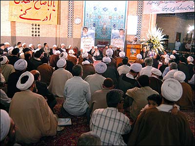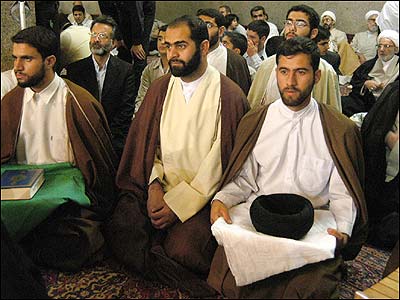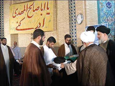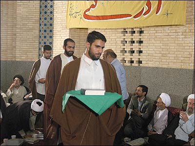 پيش از آغاز مراسم عمامه گذاری سيد مهدی (چپ) و شيخ حسين سوگند می خوردند که در راه اسلام قران قدم بردارند.