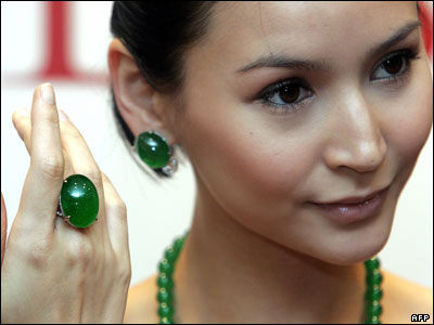 مجموعه ای از زیور آلات به ارزش چهار میلیون دلار ساخته شده از سنگ قیمتی جید و الماس در يک حراجی در هنگ کنگ.