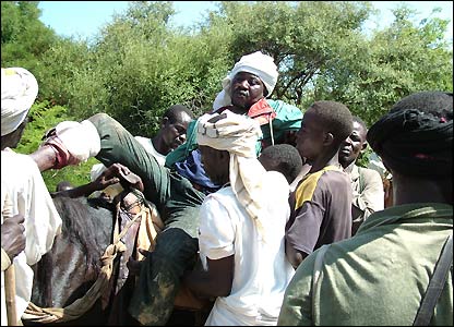 مجروحان با اسب از روستا خارج می شوند. بسياری از آنها به اردوگاه پناهاندگان گز امير منتقل می شوند که بيمارستان کوچکی دارد. بسياری از جراحات از اصابت گلوله است. حال بعضی از مجروحين آنقدر وخيم است که نمی شود جابجاشان کرد. اهالی می گفتند که دهها مجروح در مناطقی که تحت اشغال جنجويد هاست گير افتاده اند.