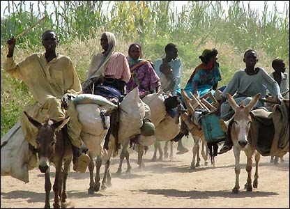 با تشديد حملات جنجويد، روستاييان بيجا شده دريافتند که پناهگاهشان ديگر امن نيست و شبانه صدها نفر از آنها به اردوگاه پناهندگان سودانی که در همان نزديکی بود رفتند. بسياری از آنها از قاطر برای جابجايی خود و ضروريات زندگی شان استفاده می کنند.
