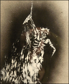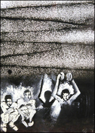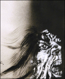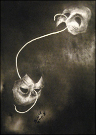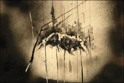 مدتی است دلآرا دارابی برای نقاشی کشيدن دچار مشکل شده است. او برخی از اين طرحها از جمله اين چهره در هم پيچيده را به دليل نداشتن قلم مو با انگشت و ناخن و اندکی رنگ سياه کشيده است.