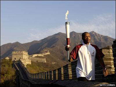 دونده ای در حال حمل مشعل پانزدهمين بازيهای آسيايی بر روی ديوار چين. این بازیها از اول ماه دسامبر به مدت دو هفته در دوحه قطر آغاز خواهد شد. مشعل این بازیها با طی مسافتی پنجاه هزار کيلومتری در طی ۵۵ روز از پانزده کشور عبور خواهد کرد.