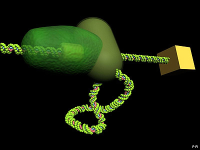 تصويری از يک موتور ميکروسکوپی که ميتوان آن را نخستين گام در راه ساخت 'مرد شش ميليون دلاری' واقعی تلقی کرد، اين سويچ بسيار کوچک که از ملکولهای دی ان ای ساخته شده است، انرژی خود را از انرژی طبيعی موجود در سلولهای زنده تامين ميکند.