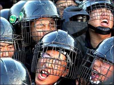 فرياد نيروهای پليس ضد شورش کره جنوبی در هنگام درگيری با تظاهرکنندگان مخالف تجارت آزاد با ايالات متحده آمريکا. اين راهپيمايی در شهر سئوگويپو و در حالی برگزار شد که نمايندگان دو دولت برای سومين روز متوالی در هتلی ساحلی ديدار می کردند.