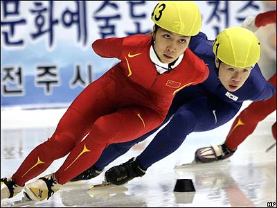 اسکیت بازانی از کشورهای کره جنوبی و چین در مسابقه سرعت هزار متر زنان در کره جنوبی