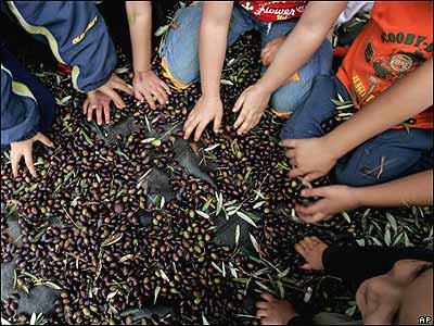 کودکان فلسطينی در حال جمع آوری زيتون در شهر رام الله در کرانه باختری