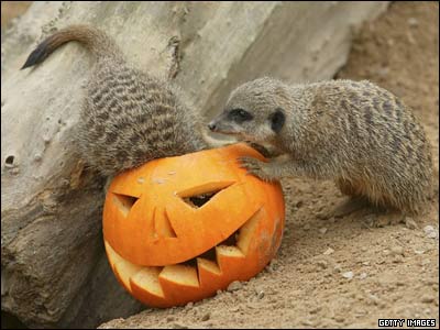 دو "میرکت" در حال بازی با یک کدوی تزیین شده برای جشن هالووین.