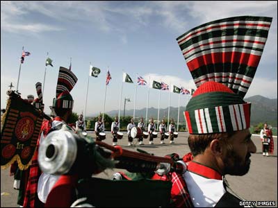 اعضای گروه موسیقی ارتش پاکستان در مقابل ساختمان نخست وزیری. ولیعهد بریتانیا برای بازدید یک هفته ای به پاکستان سفر کرده است.
