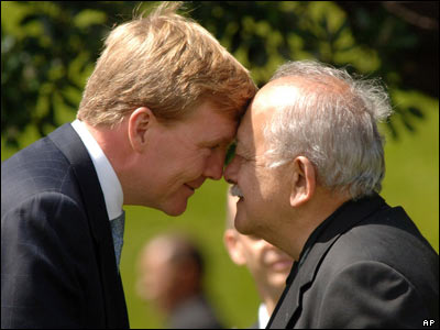 پيتر لاو از بزرگان يکی از قبايل مائوری ( بوميان نيوزلند) به روش مخصوص خود به ويليام الکساندر وليعهد هلند (سمت چپ) سلام می کند.