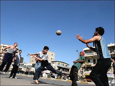 فوتبال بازی در خیابانهای خلوت مرکز بغداد. دولت عراق رفت و آمد ماشینها را برای پيشگيری از حمله احتمالی به نمازگزاران در روز جمعه ممنوع کرده است.