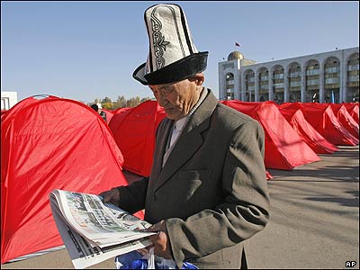صدها تن از مخالفان دولت قرقیزستان در مقابل کاخ ریاست جمهوری در میان تدابیر شدید امنیت به نشانه اعتراض چادرهایی را برپا کرده اند.