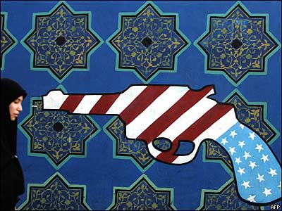 يک زن ايرانی در جريان تظاهراتی به مناسبت بيست و هفتمين سالگرد اشغال سفارت آمريکا در تهران از مقابل ديوار ساختمان سابق اين سفارتخانه عبور می کند.